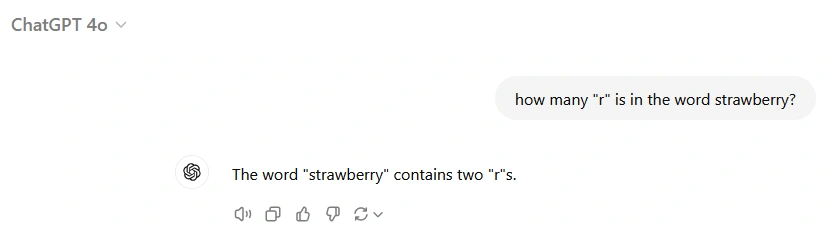P.S.: The latest versions (like ChatGPT-o1) have already overcome this problem. LLM models evolve at a speed no human can match. While you may not be able to learn faster than AI, you can certainly stay ahead of most of your peers by keeping up.